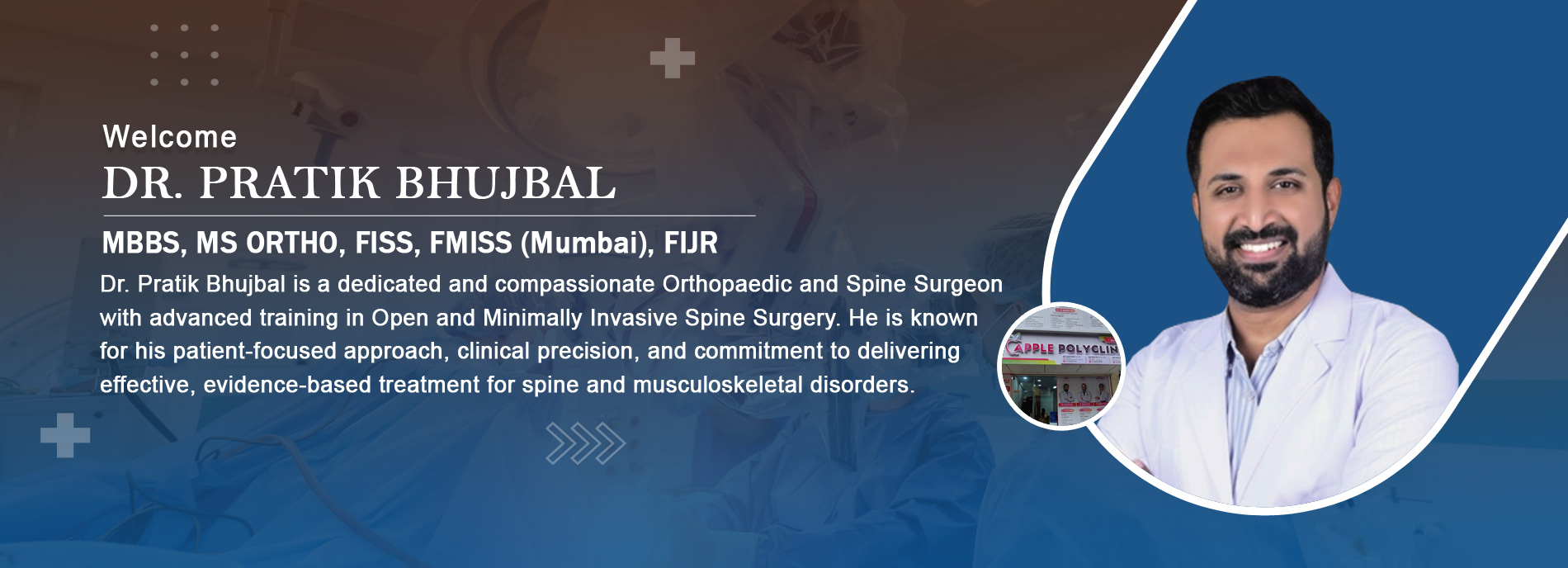 Dr. Pratik Bhujbal is a board-certified Orthopaedic Spine Surgeon with advanced expertise in Minimally Invasive Spine Surgery, Endoscopic Spine Surgery, Joint Replacement, and Interventional Pain Management. He has trained at premier institutions across Mumbai, Bangalore, Hyderabad, and Nasik, under the mentorship of renowned national and international spine surgeons.